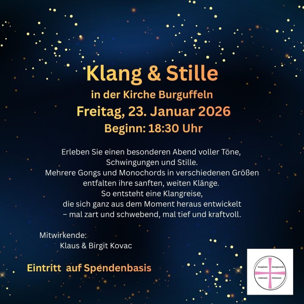 Im neuen Jahr begrüßen wir Klaus Kovac und Sigrun Thöngres in der Kirche in Burguffeln. Unter den Motto „Klang und Stille“ erleben wir einen Abend voller Töne, Schwingungen und Stille.